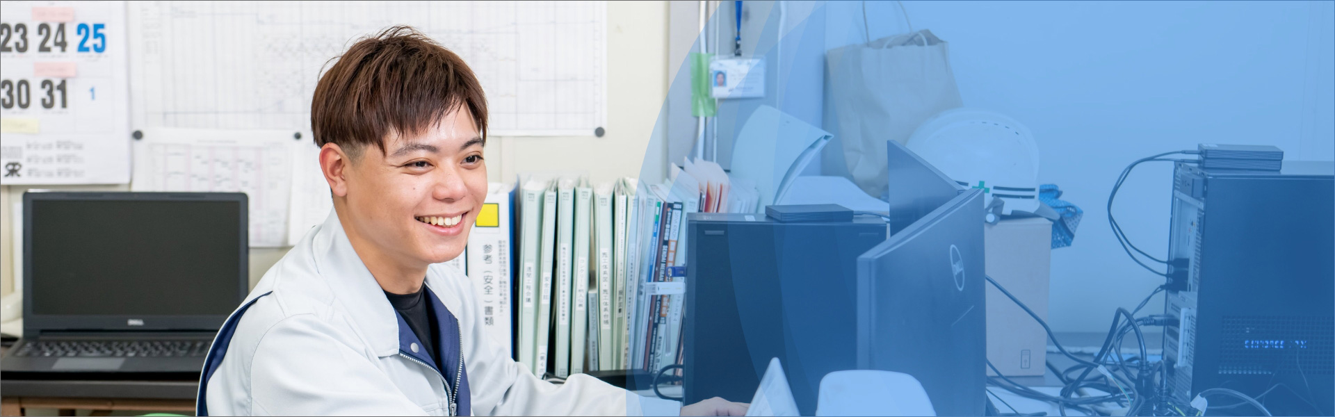 現在は現場代理人として上記作業に加えて工程管理・品質管理・発注者との連絡・調整など工事全体を管理する立場に就いています。日々の業務を通じて、現場全体を見る視野と責任感が鍛えられています。